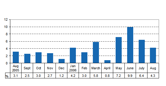 According to the original series, industrial output went up by 7.6 per cent from August 2005. Output volumes in the whole metal industry grew by 11 per cent and production in its sub-industry of manufacture of electrical and electronic equipment went up by 12 per cent. Energy supply grew by 24 per cent while output volumes in other manufacturing went up by 2 per cent. In the wood and paper industry output declined by 2 per cent from August 2005.
