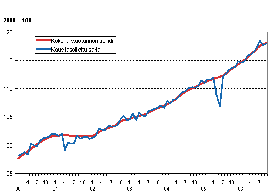 Kokonaistuotannon määrä kasvoi 3,0 prosenttia vuoden 2006 syyskuussa edellisvuoden syyskuuhun verrattuna. Kuukausikuvaajan kuudesta päätoimialasta ainoastaan alkutuotanto laski. Vuoden 2006 syyskuussa oli yksi työpäivä vähemmän kuin edellisvuoden vastinkuukaudessa. Työpäiväkorjattuna kokonaistuotannon määrä kasvoi 3,9 prosenttia.