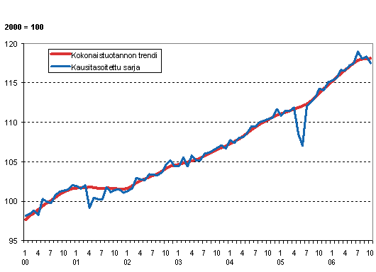 Kokonaistuotannon määrä kasvoi 3,3 prosenttia vuoden 2006 lokakuussa edellisvuoden lokakuuhun verrattuna. Kuukausikuvaajan kuudesta päätoimialasta ainoastaan alkutuotanto laski. Vuoden 2006 lokakuussa oli yksi työpäivä enemmän kuin edellisvuoden vastinkuukaudessa. Työpäiväkorjattuna kokonaistuotannon määrä kasvoi 2,4 prosenttia.