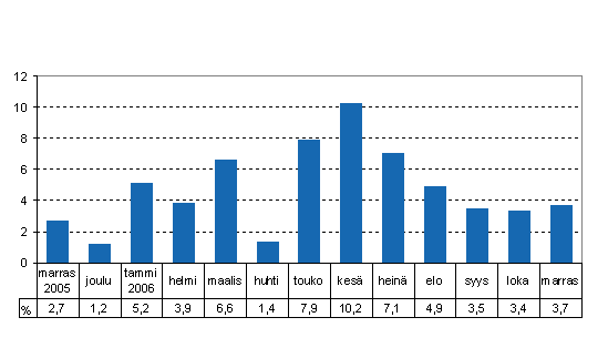 Kokonaistuotanto oli 3,7 prosenttia suurempi kuin vuoden 2005 marraskuussa