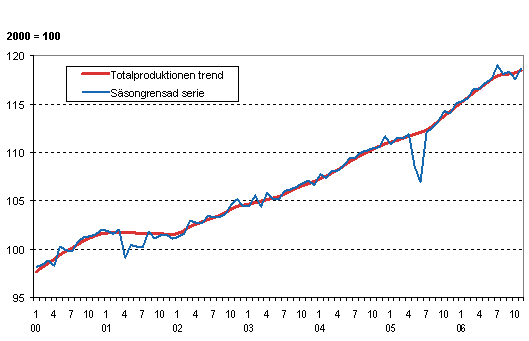 Volymen av totalproduktionen 2000-2006, trend och säsongrensad serie