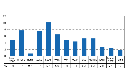 Kokonaistuotanto oli 1,7 prosenttia suurempi kuin vuoden 2006 helmikuussa