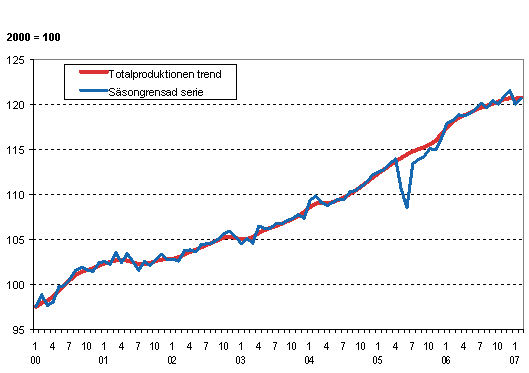 Volymen av totalproduktionen 2000-2007, trend och säsongrensad serie