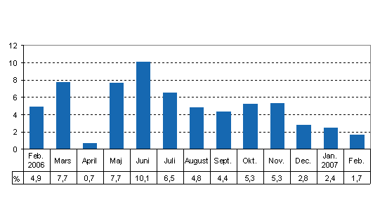 I februari år 2007 ökade volymen av totalproduktionen med 1,7 procent jämfört med februari året innan. Av de sex huvudnäringarna i månadsgrafen sjönk bara industrin.