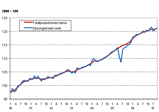 Volymen av totalproduktionen 2000-2007, trend och säsongrensad serie