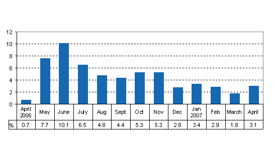 The volume of total output grew by 3.1 per cent in April 2007 from April of the previous year. April 2007 had one working day more than the comparison month of the previous year. Adjusted for working days, total output grew by 1.9 per cent year-on-year.