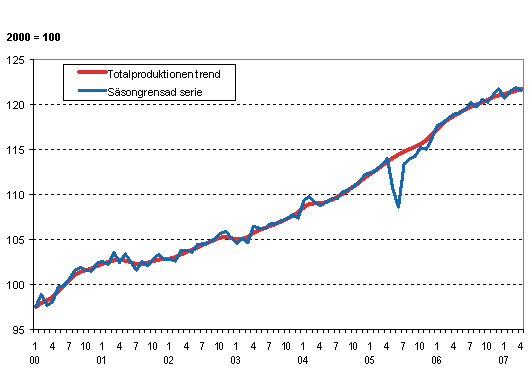 Volymen av totalproduktionen 2000-2007, trend och säsongrensad serie