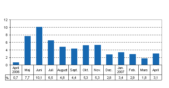 I april år 2007 ökade volymen av totalproduktionen med 3,1 procent jämfört med april året innan. I april år 2007 fanns det en arbetsdag mer än i motsvarande månad föregående år. Den arbetsdagskorrigerade totalproduktionen ökade med 1,9 procent jämfört med året innan.