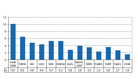 Kokonaistuotanto oli 1,6 prosenttia suurempi kuin vuoden 2006 kesäkuussa