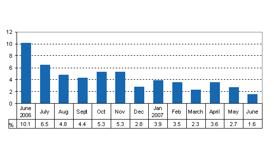 According to the original series of the volume index of industrial output, industrial output diminished by 1.6 per cent from June 2006. Output volumes in the whole metal industry grew by 2 per cent and production in its sub-industry of manufacture of electrical and electronic equipment went up by one per cent. In the wood and paper industry output fell by four per cent.