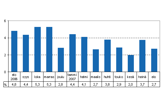 Kokonaistuotanto oli 2,7 prosenttia suurempi kuin vuoden 2006 elokuussa