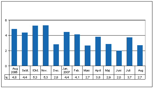 I augusti år 2007 ökade volymen av totalproduktionen med 2,7 procent jämfört med augusti året innan.