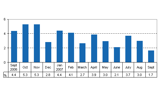 According to the original series of the volume index of industrial output, industrial output diminished by 0.8 per cent from September 2006. Output volumes in the whole metal industry fell by one per cent and production in its sub-industry of manufacture of electrical and electronic equipment decreased by 6 per cent. In the wood and paper industry, output decreased by one per cent. Energy supply fell by 9 per cent, but other manufacturing including chemical industry grew by 3 per cent from September 2006.