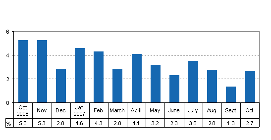 Construction output grew by 5 per cent. Primary production went up by 9 per cent as fellings increased by 12 per cent from October 2006. Output in other service industries grew by 4 per cent, but remained on level with the corresponding month of the year before in transport.