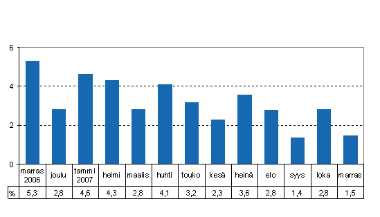 Kokonaistuotanto oli 1,5 prosenttia suurempi kuin vuoden 2006 marraskuussa