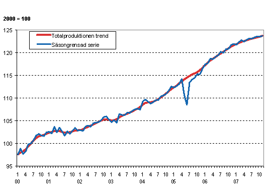 Volymen av totalproduktionen 2000-2007, trend och säsongrensad serie