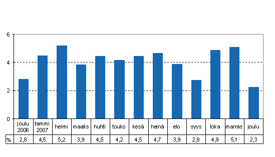 Kokonaistuotanto oli 2,3 prosenttia suurempi kuin vuoden 2006 joulukuussa