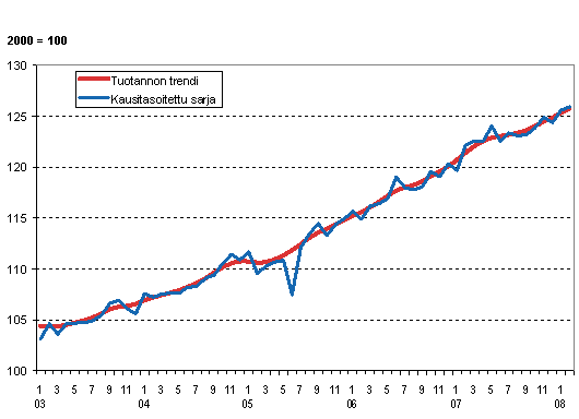 Tuotannon volyymi 2003- 2008, trendi ja kausitasoitettu sarja