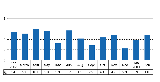 Seasonally adjusted output increased by 0.3 per cent in February from the month before. The growth from February 2007 amounted to 4.8 per cent. The data derive from Statistics Finland's Trend Indicator of Output.