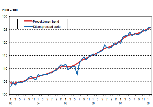 Produktionens volym 2003-2008, trend och säsongrensad serie