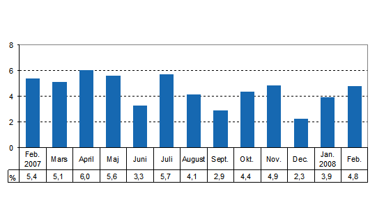 Den säsongrensade produktionen ökade i februari med 0,3 procent från föregående månad. Jämfört med februari 2007 var ökningen 4,8 procent. Uppgifterna framgår av Statistikcentralens konjunkturindikator för produktionen.