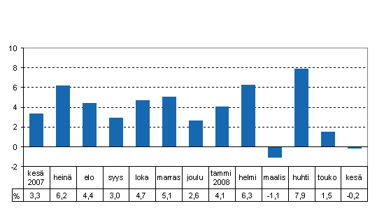 Jalostuksen ennakoidaan olleen alkuperäisten sarjojen mukaan tarkasteltuna reilut kolme prosenttia suurempi kuin edellisvuoden kesäkuussa. Palveluiden ennakoidaan olleen vajaat kaksi prosenttia ja alkutuotannon yhdeksän prosenttia pienempi kuin vuoden 2007 kesäkuussa. Jalostus sisältää teollisuuden ja rakentamisen. Palvelut sisältää kaupan, majoitus- ja ravitsemustoiminnan, liikenteen, liike-elämän palvelut sekä kiinteistö-, vuokraus- ja tutkimuspalvelut, rahoitus- ja vakuutustoiminnan ja julkiset palvelut. Alkutuotannolla tarkoitetaan maa-, riista-, metsä- ja kalataloutta.