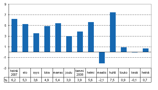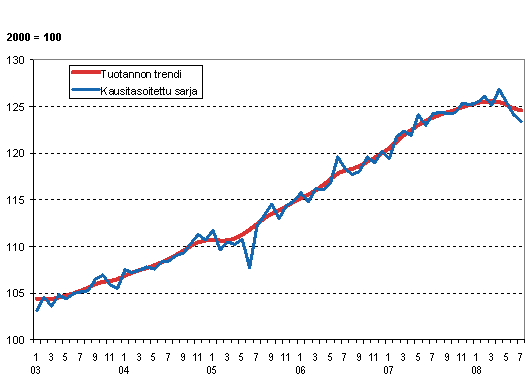 Kausitasoitettu tuotanto väheni heinäkuussa 0,5 prosenttia edelliskuukaudesta. Työpäiväkorjattuna tuotanto väheni prosentin vuoden 2007 heinäkuusta. Vuoden 2008 heinäkuussa oli yksi työpäivä enemmän kuin vuotta aiemmin. Alkuperäisten sarjojen mukaan tuotanto oli 0,7 prosenttia suurempi kuin edellisvuonna. Tiedot käyvät ilmi Tilastokeskuksen tuotannon suhdannekuvaajasta.
