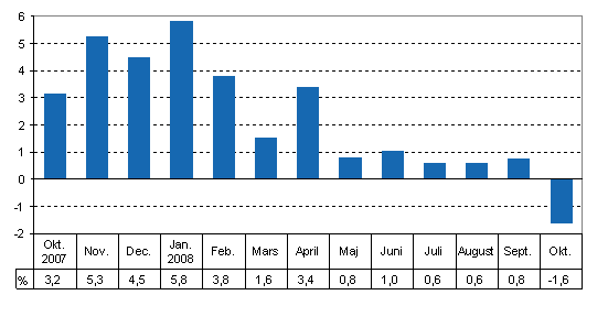 Den säsongrensade produktionen sjönk med 1,1 procent från föregående månad. Den arbetsdagskorrigerade produktionen minskade med 1,6 procent från oktober 2007. Enligt de ursprungliga serierna var produktionen 1,5 procent mindre än i oktober året innan. Uppgifterna framgår av Statistikcentralens konjunkturindikator för produktionen. Uppgifterna är preliminära och revideras senare.