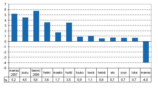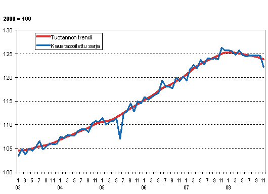 Kausitasoitettu tuotanto laski 1,9 prosenttia edelliskuukaudesta. Työpäiväkorjattuna tuotanto laski 4,0 prosenttia vuoden 2007 marraskuusta. Alkuperäisten sarjojen mukaan tuotanto oli 6,0 prosenttia pienempi kuin edellisvuoden marraskuussa. Vuoden 2008 marraskuussa oli kaksi työpäivää vähemmän kuin vuotta aiemmin. Tiedot käyvät ilmi Tilastokeskuksen tuotannon suhdannekuvaajasta. Tiedot ovat ennakollisia ja tarkentuvat jatkossa.