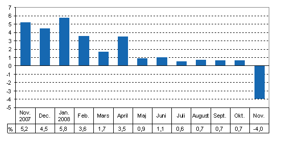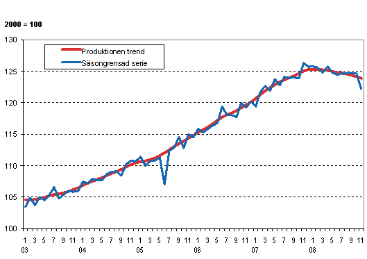 Den säsongrensade produktionen sjönk med 1,9 procent från föregående månad. Den arbetsdagskorrigerade produktionen minskade med 4,0 procent från november 2007. Enligt de ursprungliga serierna var produktionen 6,0 procent mindre än i november året innan. November år 2008 hade två arbetsdagar mindre än föregående år. Uppgifterna framgår av Statistikcentralens konjunkturindikator för produktionen. Uppgifterna är preliminära och revideras senare.