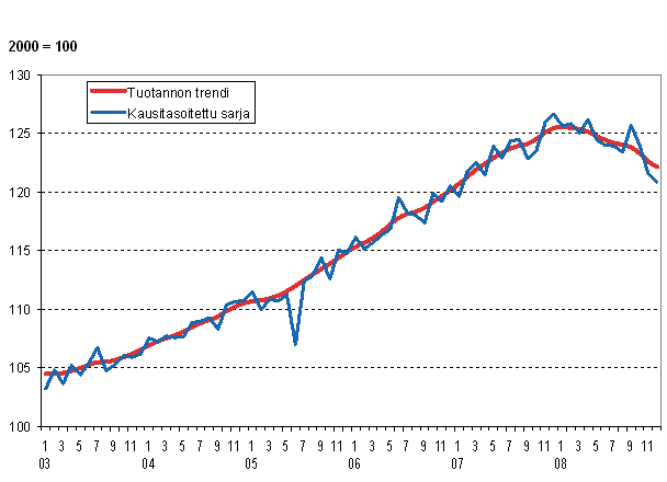 Kausitasoitettu tuotanto väheni 0,6 prosenttia edelliskuukaudesta. Työpäiväkorjattuna tuotanto pieneni 4,8 prosenttia vuoden 2007 joulukuusta. Alkuperäisten sarjojen mukaan tuotanto oli 2,1 prosenttia pienempi kuin edellisvuoden joulukuussa. Vuoden 2008 joulukuussa oli kolme työpäivää enemmän kuin vuotta aiemmin. Tiedot käyvät ilmi Tilastokeskuksen tuotannon suhdannekuvaajasta. Tiedot ovat ennakollisia ja tarkentuvat jatkossa.