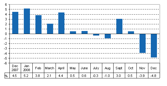 Seasonally adjusted output fell by 0.6 per cent in December from the month before. Adjusted for working days, output fell by 4.8 per cent from December 2007. According to the original series, output was 2.1 per cent smaller than in December of the year before. December 2008 had three working days more than the corresponding month of the previous year. The data derive from Statistics Finland's Trend Indicator of Output. The data are preliminary and will become revised later.