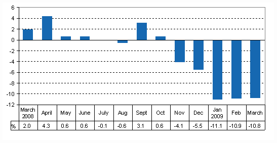 Seasonally adjusted output fell by 1.1 per cent in March from the month before. Adjusted for working days, output fell by 10,8 per cent from March 2008. March 2009 had three working days more than the corresponding month of the previous year. According to the original series, output was 8.1 per cent smaller than in March of the year before. The data derive from Statistics Finland's Trend Indicator of Output. The data are preliminary and will become revised later.
