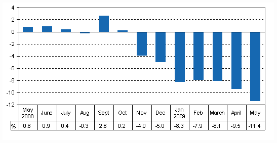 Seasonally adjusted output diminished by 1.9 per cent from the month before. Adjusted for working days, output fell by 11.4 per cent from May 2008. May 2009 had two working days less than the corresponding month of the previous year. According to the original series, output was 12.8 per cent lower than in May of the year before. The data derive from Statistics Finland's Trend Indicator of Output. The data are preliminary and will become revised later.