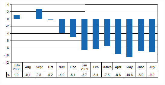 Correction 8 October 2009. Output of the national economy fell in July