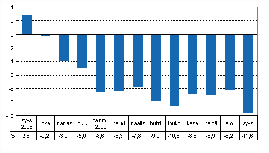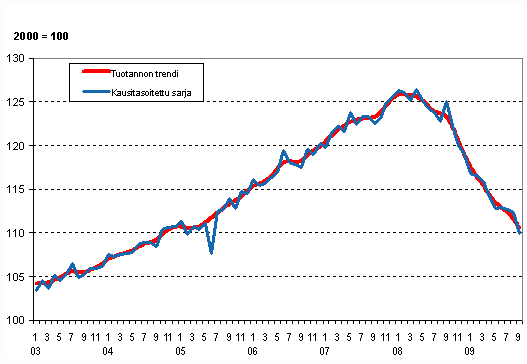 Kausitasoitettu tuotanto väheni 2,1 prosenttia edelliskuukaudesta. Työpäiväkorjattuna tuotanto väheni 11,6 prosenttia vuoden 2008 syyskuusta. Tiedot käyvät ilmi Tilastokeskuksen tuotannon suhdannekuvaajasta. Tiedot ovat ennakollisia ja tarkentuvat jatkossa.