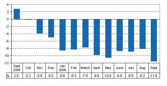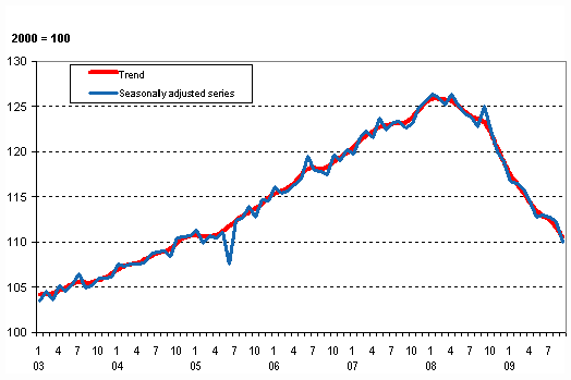 Seasonally adjusted output decreased by 2.1 per cent from the month before. Adjusted for working days, output fell by 11.6 per cent from September 2008. The data derive from Statistics Finland's Trend Indicator of Output. The data are preliminary and will become revised later.