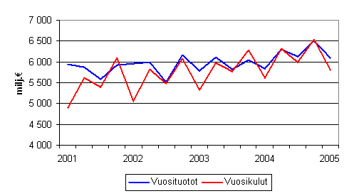 Kuntien vuosituotot ja -kulut 2001/1 - 2005/1, neljänneksittäin