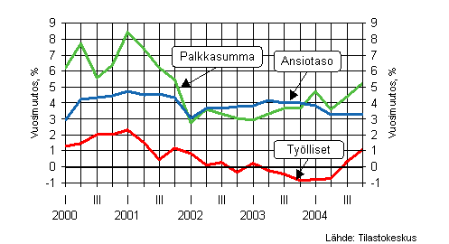 Palkkasumman kasvu on pysytellyt vuoden 2002 alusta lähtien 3 - 6 prosentin välillä neljännesvuosittain tarkasteltuna. Vuoden 2004 ensimmäisellä neljänneksellä palkkasummaa kasvattivat voimakkaasti erityisesti maaliskuussa maksetut tulospalkkiot. Palkkasumman loppuvuodesta kiihtynyt kasvu näyttäisi johtuvan työllisten määrän lisäyksestä. Työllisten määrä kääntyi kasvuun vuoden 2004 kolmannella neljänneksellä, ja kasvu jatkui selkeänä myös vuoden viimeisellä neljänneksellä.