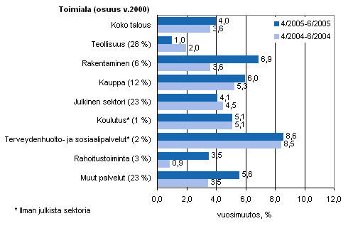 Rakennusalalla kasvua kertyi 6,9 prosenttia. Kasvu muodostui talonrakentamisen 6,5 prosentin sekä maa- ja vesirakentamisen 8,2 prosentin palkkasumman lisäyksistä. Rakentamisen vuoden 2004 huhti-kesäkuun kasvu oli 3,6 prosenttia.