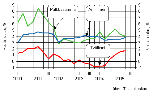 Palkkasumman kasvu on pysytellyt vuoden 2002 alusta lähtien 3 - 6 prosentin välillä neljännesvuosittain tarkasteltuna. Vuoden 2004 ensimmäisellä neljänneksellä palkkasummaa kasvattivat voimakkaasti erityisesti maaliskuussa maksetut tulospalkkiot. Vuoden 2005 aikana koko talouden palkkasumman kasvu on hidastunut huolimatta työllisten ja ansiotason myönteisestä kehityksestä. Työllisten määrä kääntyi kasvuun vuoden 2004 kolmannella neljänneksellä, ja kasvu on jatkunut myös vuoden 2005 ensimmäisillä neljänneksillä. Paperiteollisuuden työtaistelut eivät vaikuta työllisten määrään, sillä lakossa tai työnseisausten vuoksi tilapäisesti poissa ansiotyöstä olevat lasketaan työllisiksi. Ansiotasoindeksin kasvu pysyi tasaisena vuoden 2004 toiselta neljännekseltä lähtien ja kiihtyi lievästi vuoden 2005 toisella neljänneksellä.