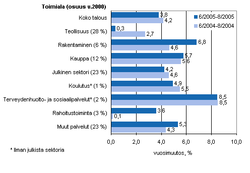 Palkkasumma kasvoi kaikilla päätoimialoilla. Nopeinta palkkasumman kasvu oli edelleen yksityisissä terveydenhuolto- ja sosiaalipalveluissa, joissa kasvua kertyi 8,5 prosenttia edellisvuodesta. Palkkasummat kohosivat ripeästi myös rakentamisen (6,8 %), kaupan (5,7 %) ja muiden palveluiden (5,3 %) toimialoilla. Hitainta kasvu oli teollisuudessa (0,3 %), jossa jäätiin selvästi edellisvuoden kasvusta. Teollisuuden palkkasumman kehitystä on hidastanut touko-kesäkuun paperiteollisuuden työtaistelut.