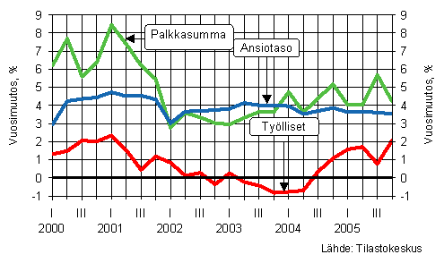 Palkkasumman kasvu on pysytellyt vuoden 2002 alusta lähtien 3 - 6 prosentin välillä neljännesvuosittain tarkasteltuna. Vuoden 2004 ensimmäisellä neljänneksellä palkkasummaa kasvattivat voimakkaasti, erityisesti maaliskuussa maksetut, tulospalkkiot. Vuoden 2005 ensimmäisellä vuosipuoliskolla palkkasumma kasvoi 4 prosenttia ja kolmannella neljänneksellä peräti 5,9 prosenttia vuotta aiemmasta. Kolmannella neljänneksellä palkkasumman kasvua kiihdytti syyskuussa maksetut tulospalkkiot. Viimeisellä neljänneksellä palkkasumma oli 4,2 prosenttia vuoden 2004 vastaavaa ajanjaksoa suurempi. Työllisten määrä kääntyi kasvuun vuoden 2004 kolmannella neljänneksellä, ja kasvu on jatkunut myös vuoden 2005 aikana, kiihtyen vuoden viimeisellä neljänneksellä. Ansiotasoindeksin kehitys on pysynyt jo pitkään tasaisena hieman alle 4 prosentin kasvussa.