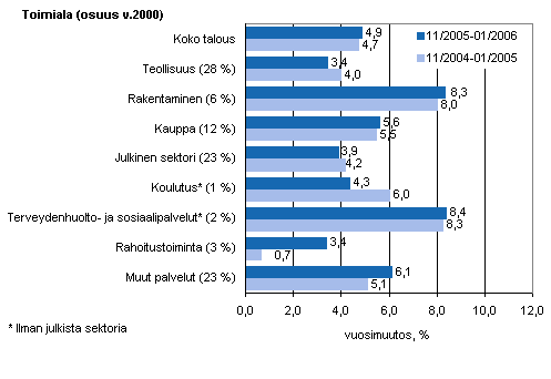 Palkkasumman vuosimuutos ajanjaksolla 11/2005-1/2006 ja 11/2004-1/2005, %