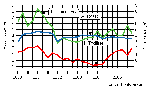 Palkkasumman kasvu on pysytellyt vuoden 2002 alusta lähtien 3 - 6 prosentin välillä neljännesvuosittain tarkasteltuna. Vuoden 2004 ensimmäisellä neljänneksellä palkkasummaa kasvattivat voimakkaasti, erityisesti maaliskuussa maksetut, tulospalkkiot. Vuoden 2005 ensimmäisellä vuosipuoliskolla palkkasumma kasvoi 4 prosenttia ja kolmannella neljänneksellä peräti 5,9 prosenttia vuotta aiemmasta. Kolmannella neljänneksellä palkkasumman kasvua kiihdytti syyskuussa maksetut tulospalkkiot. Viimeisellä neljänneksellä palkkasumma oli 4,2 prosenttia vuoden 2004 vastaavaa ajanjaksoa suurempi. Työllisten määrä kääntyi kasvuun vuoden 2004 kolmannella neljänneksellä, ja kasvu on jatkunut myös vuoden 2005 aikana, kiihtyen vuoden viimeisellä neljänneksellä. Ansiotasoindeksin kehitys on pysynyt jo pitkään tasaisena hieman alle 4 prosentin kasvussa.