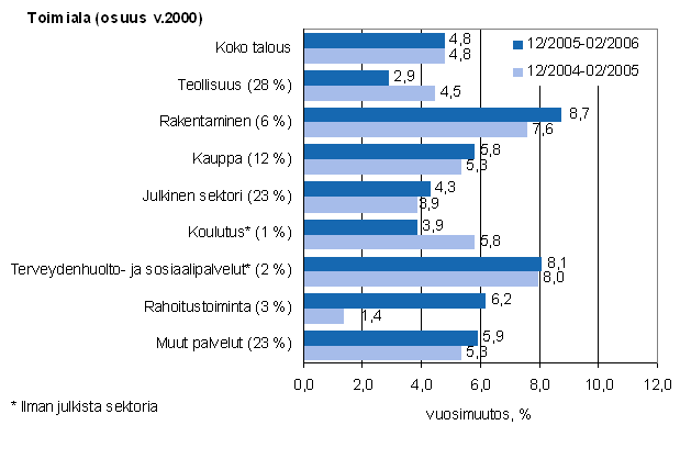 Palkkasumman vuosimuutos ajanjaksolla 12/2005-02/2006 ja 12/2004-02/2005, %