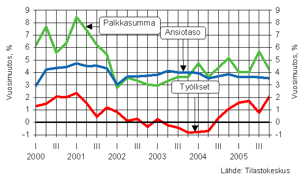 Palkkasumman kasvu on pysytellyt vuoden 2002 alusta lähtien 3 - 6 prosentin välillä neljännesvuosittain tarkasteltuna. Vuoden 2004 ensimmäisellä neljänneksellä palkkasummaa kasvattivat voimakkaasti, erityisesti maaliskuussa maksetut, tulospalkkiot. Vuoden 2005 ensimmäisellä vuosipuoliskolla palkkasumma kasvoi 4 prosenttia ja kolmannella neljänneksellä peräti 5,9 prosenttia vuotta aiemmasta. Kolmannella neljänneksellä palkkasumman kasvua kiihdytti syyskuussa maksetut tulospalkkiot. Viimeisellä neljänneksellä palkkasumma oli 4,2 prosenttia vuoden 2004 vastaavaa ajanjaksoa suurempi. Työllisten määrä kääntyi kasvuun vuoden 2004 kolmannella neljänneksellä, ja kasvu on jatkunut myös vuoden 2005 aikana, kiihtyen vuoden viimeisellä neljänneksellä. Ansiotasoindeksin kehitys on pysynyt jo pitkään tasaisena hieman alle 4 prosentin kasvussa.