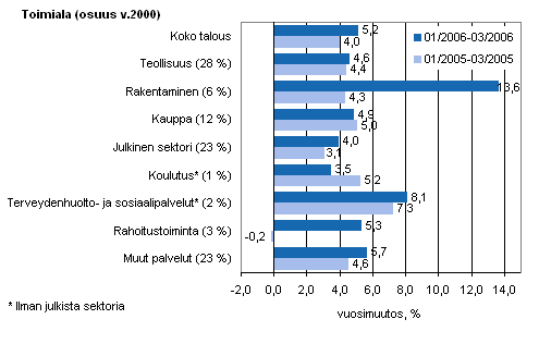 Palkkasumman vuosimuutos ajanjaksolla 01/2006-03/2006 ja 01/2005-03/2005, %