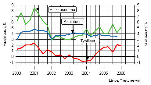 Koko talouden palkkasumma oli vuoden 2006 ensimmäisellä vuosineljänneksellä 5,2 prosenttia suurempi kuin vuotta aikaisemmin vastaavana ajanjaksona. Kasvu kiihtyi vuotta aiemmasta, jolloin vastaava muutos oli 4 prosenttia.
