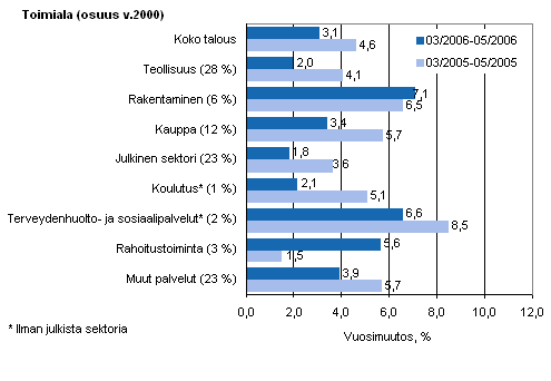 Palkkasumman vuosimuutos ajanjaksolla 03/2006-05/2006 ja 03/2005-05/2005, %